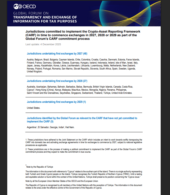 Den sorgfältigen, wenn auch etwas langweiligen Beobachtern der Organisation für wirtschaftliche Zusammenarbeit und Entwicklung (OECD) zufolge haben sich diese 48 Nationen zu dem recht aufdringlichen Akt verpflichtet, ab dem 1. Januar 2026 standardisierte Krypto-Transaktionsdaten zu sammeln. Der tatsächliche Austausch dieser Informationen, die vermutlich unter „Verschiedenes und leicht verdächtig“ abgelegt werden sollen, wird für 2027 erwartet. 🙄